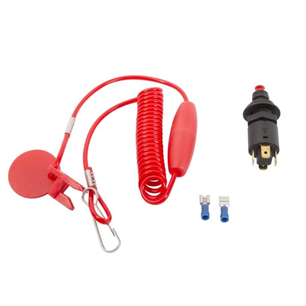 Emergency cut-off switch with coiled lanyard.